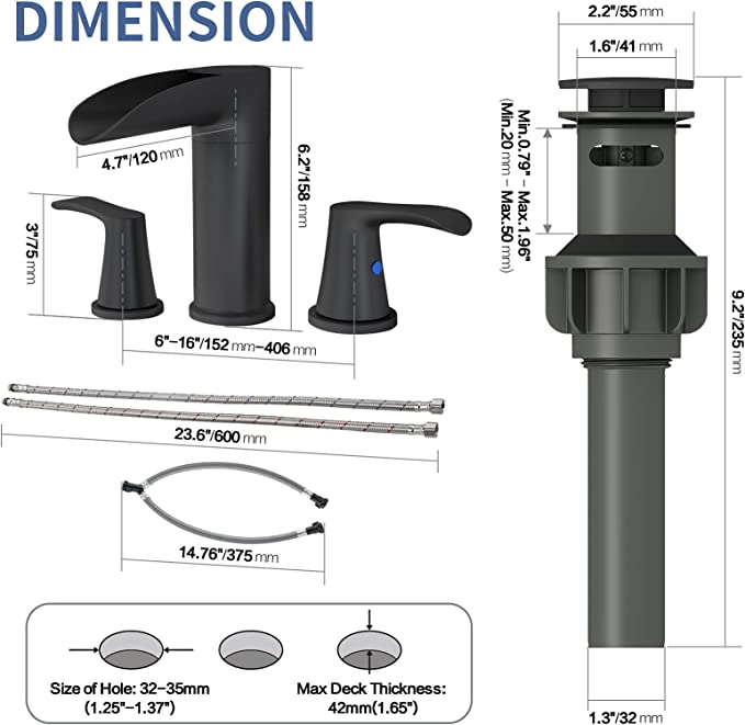 | Included Components | 1 x Bathroom Faucet Body 2 x Handles 2 x 3/8" Supply Lines(Hot & Cold) 1 x Pop-Up Drain with Overflow ( Fits 1.65"~1.9" diameter drain holes) 1 x Mounting Accessories |