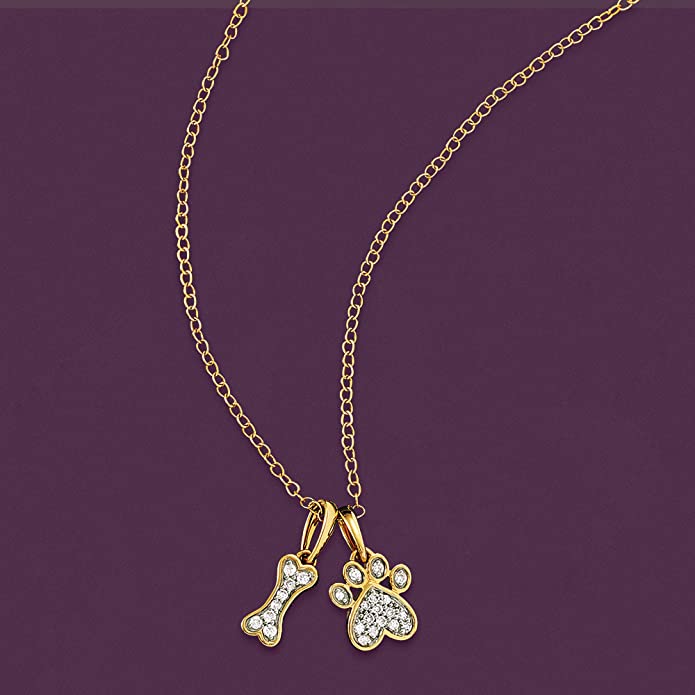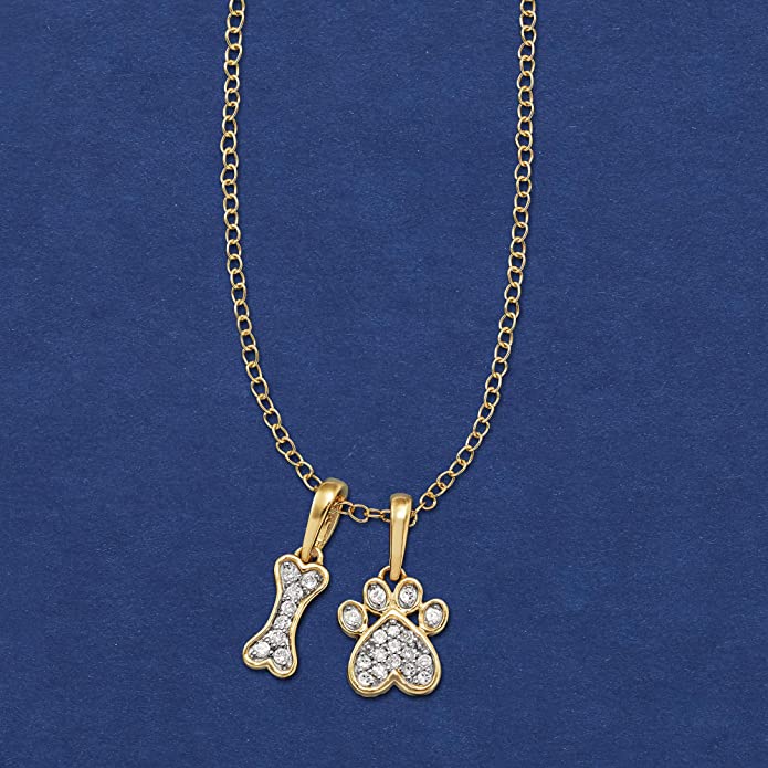 DIAMONDS IN 14KT YELLOW GOLD — .10 ct. t.w. diamond dog bone and paw pendant necklace in 14kt yellow gold. Round diamonds. Polished finish. Single bale dog bone and paw pendants fit chains up to 2.1mm and are 5/8 in. long by 3/8 in. wide. Suspends from a 16 in. long by 1.25mm wide cable chain with a 2 in. extender. Springring clasp.