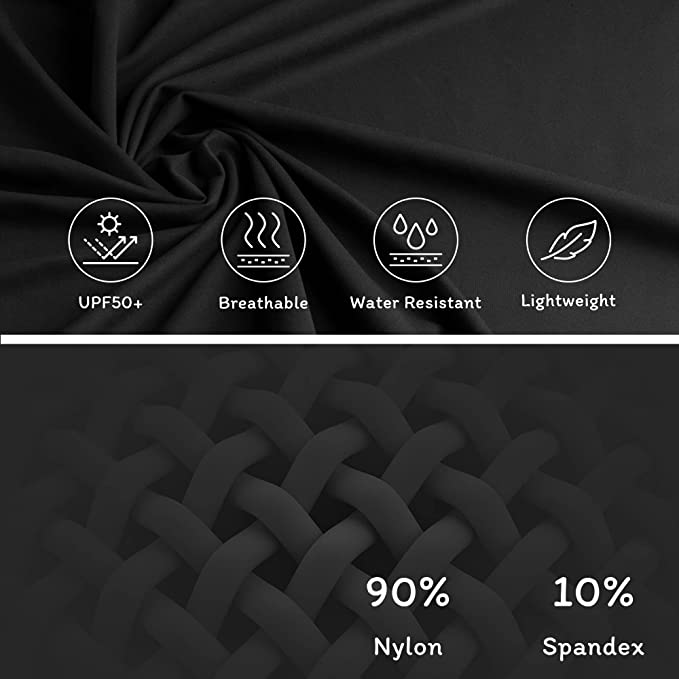 Production Materials: 90% Nylon and 10% Spandex,lightweight, tear-resistant, scratch-resistant, breathable and capable of 4-way-stretch, with 3D tailoring fits better and make your body feel free, UPF 50+ will protect your skin from the sun's harmful rays when you are outdoors