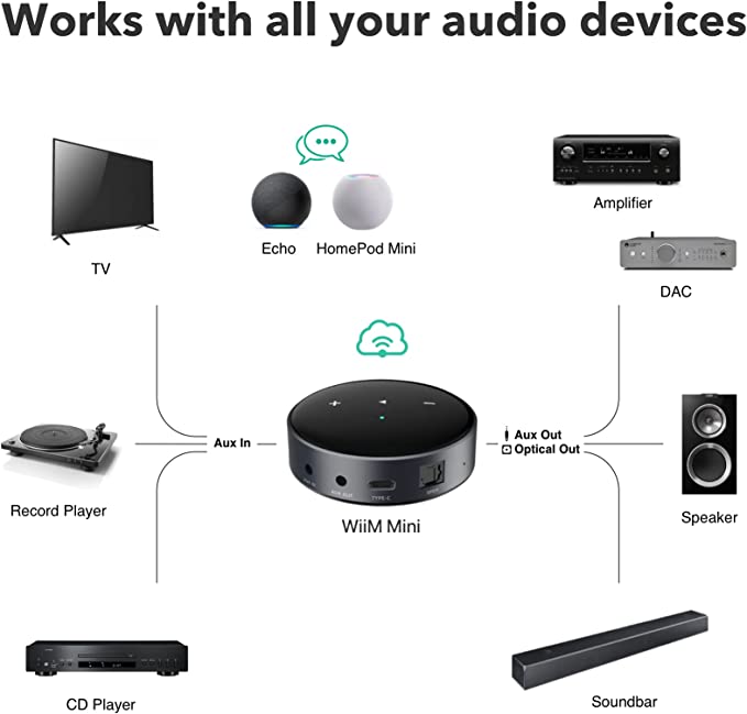 WiiM Mini AirPlay2 Wireless Audio Streamer, Multiroom Stereo, Preamplifier, Works with Alexa and Siri Voice Assistants, Stream Hi-Res Audio from Spotify, Amazon Music and More