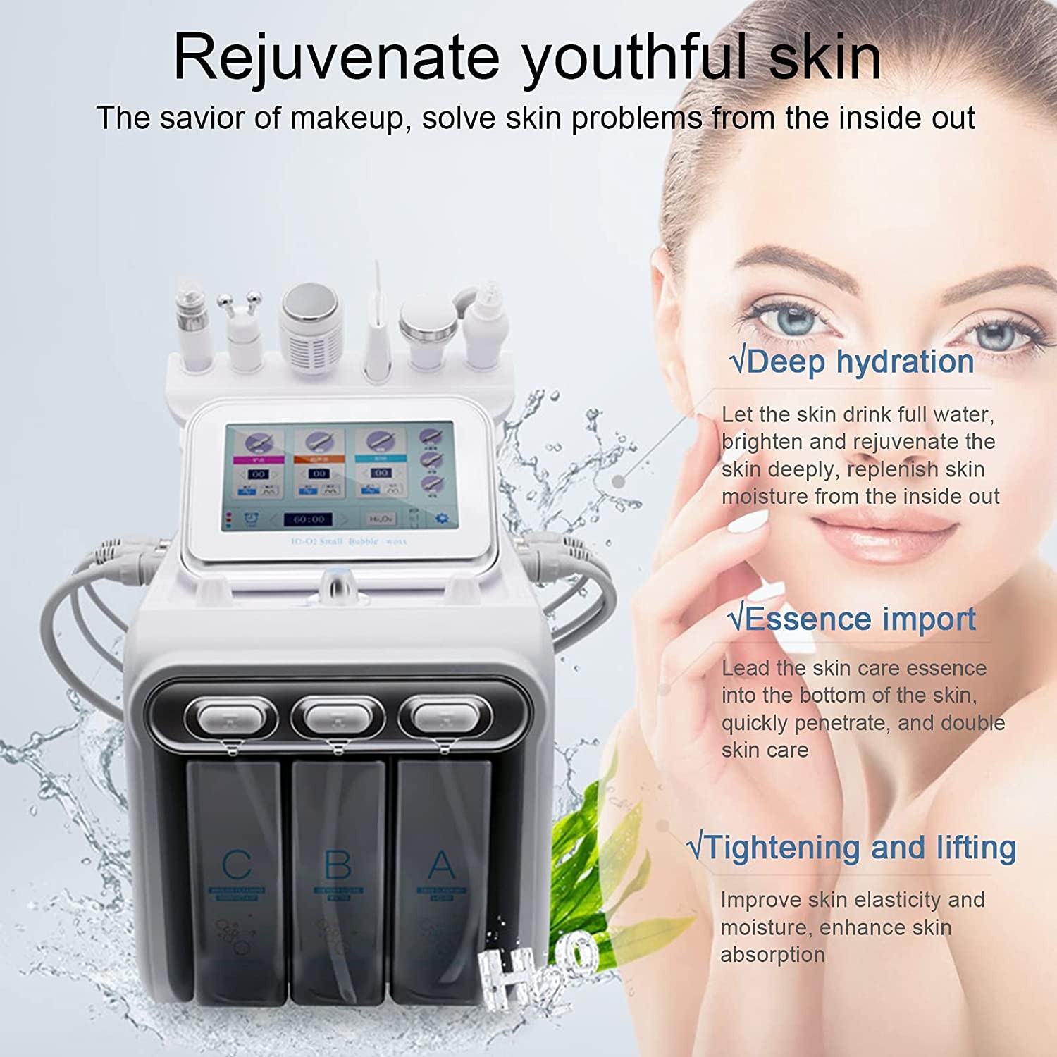 Product characteristics: applies advanced technologies, turns purified water into hydrogen and oxygen water, so that water can quickly penetrate into the skin to achieve the effect of skin cleaning, increase metabolism.