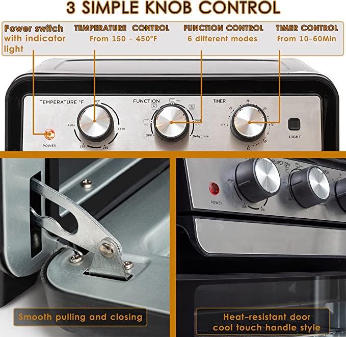 SUITABLE FAMILY SIZE & SPACE SAVING DESIGN - 23QT large air fryer allows you to prepare family-sized quantities for up to 10 people at once. For added safety, it has a power switch indicator light when operating, but when the oven door is opened, all operations will be auto shut off, and also, when cooking time up, it will have a ready bell voice from the 0-60 timer mode, simple and stylish design, suitable for any home kitchen.