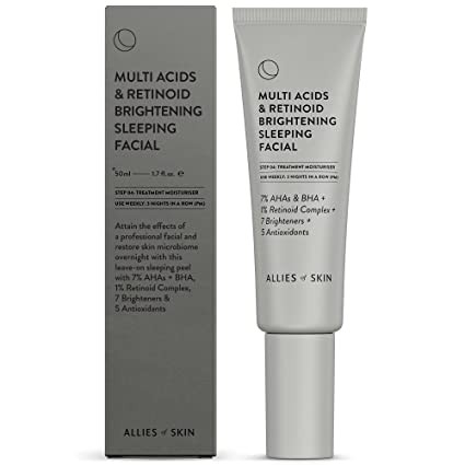 Multi Acids & Retinoid Brightening Sleeping Facial exfoliates and brightens the skin while you sleep. This next-generation sleeping peel helps the skin attain its optimal level of exfoliation while simultaneously boosting hydration and preventing any dryness and irritation.
