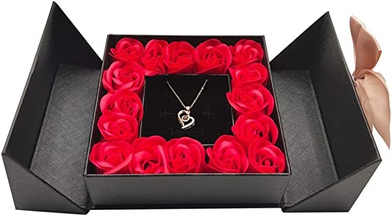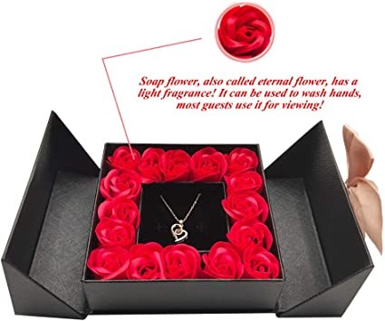 *Packaging: Heart design necklace, a black gift box with double doors, 16 soap roses, a magnet bow and a small white gift bag.