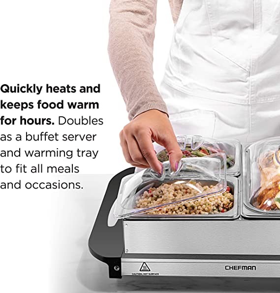 Keep food warm throughout the day. The adjustable temperature makes it easy to heat food quickly, while the fuse safety feature prevents food from overheating, so you can keep food warm for hours. Keep hot plate on all day to keep food warm, or adjust to height to quickly reheat appetizers