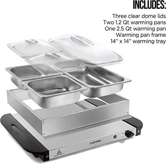 Includes coffee server Three stainless steel warming pots Includes two 1 2 qt warming pot and one 2 5 qt warming pot. 3 tall domed clear lids retain heat. Accessories are dishwasher safe for easy cleaning