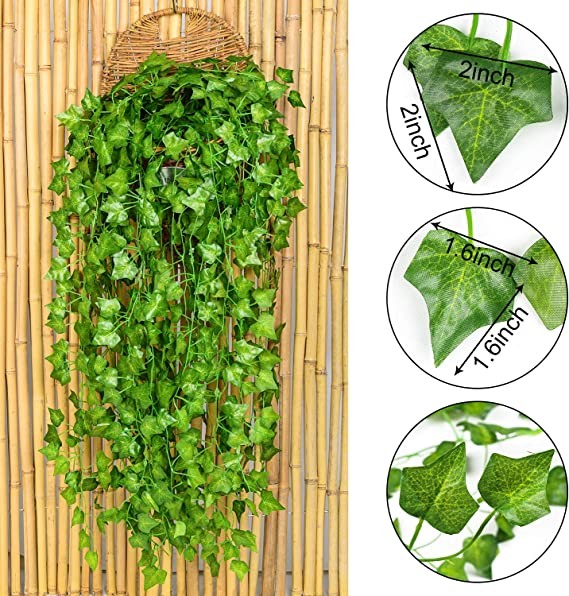 Each ivy hangings vine approx 7FT long,total 84 Ft,80 leaves diameter approx 1.4-1.8inch.comes with 12x artificial ivy vine,plastic vine silk leaves.(Note: The product contains 12 individual strands, but is packaged in a bag.)