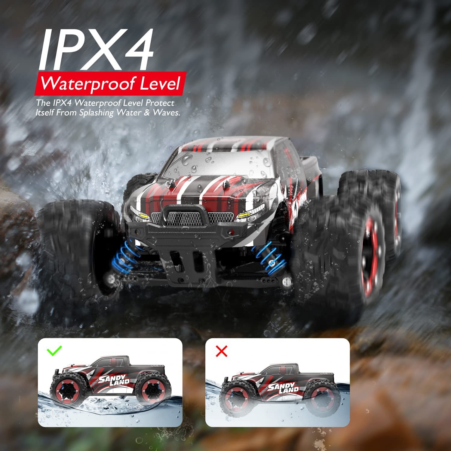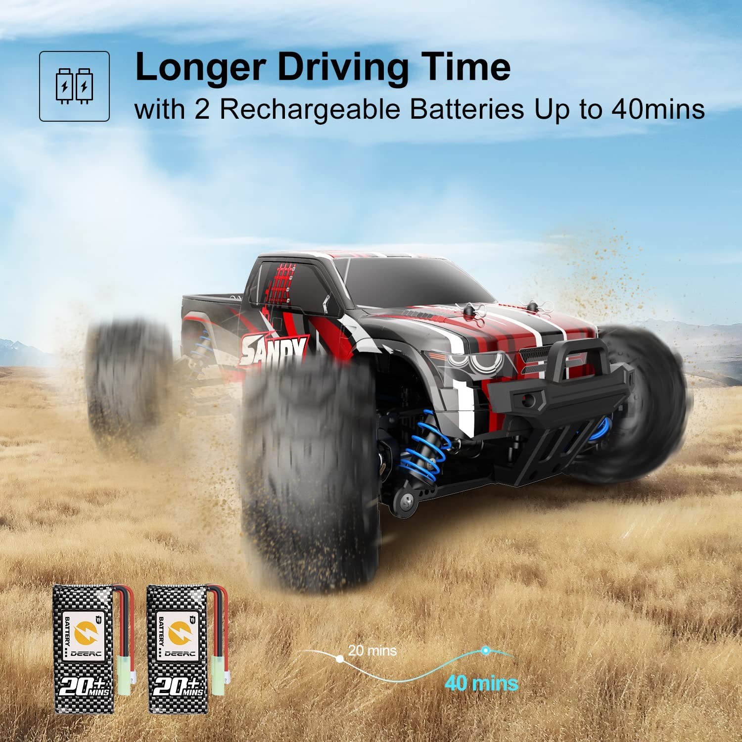All-terrain Racing: Independent suspension design is introduced to both front and rear suspension on this high-speed RC car. The damped metal shocks facilitate themselves to increase or decrease the spring tension for the demands of desired traction and suspension travels. The four wheels are all packed with metal springs which gives support to unexpected dropping and the undulating nature of the ground. The harsh environment cannot stop your racing journey, drive the DEERC where you want!