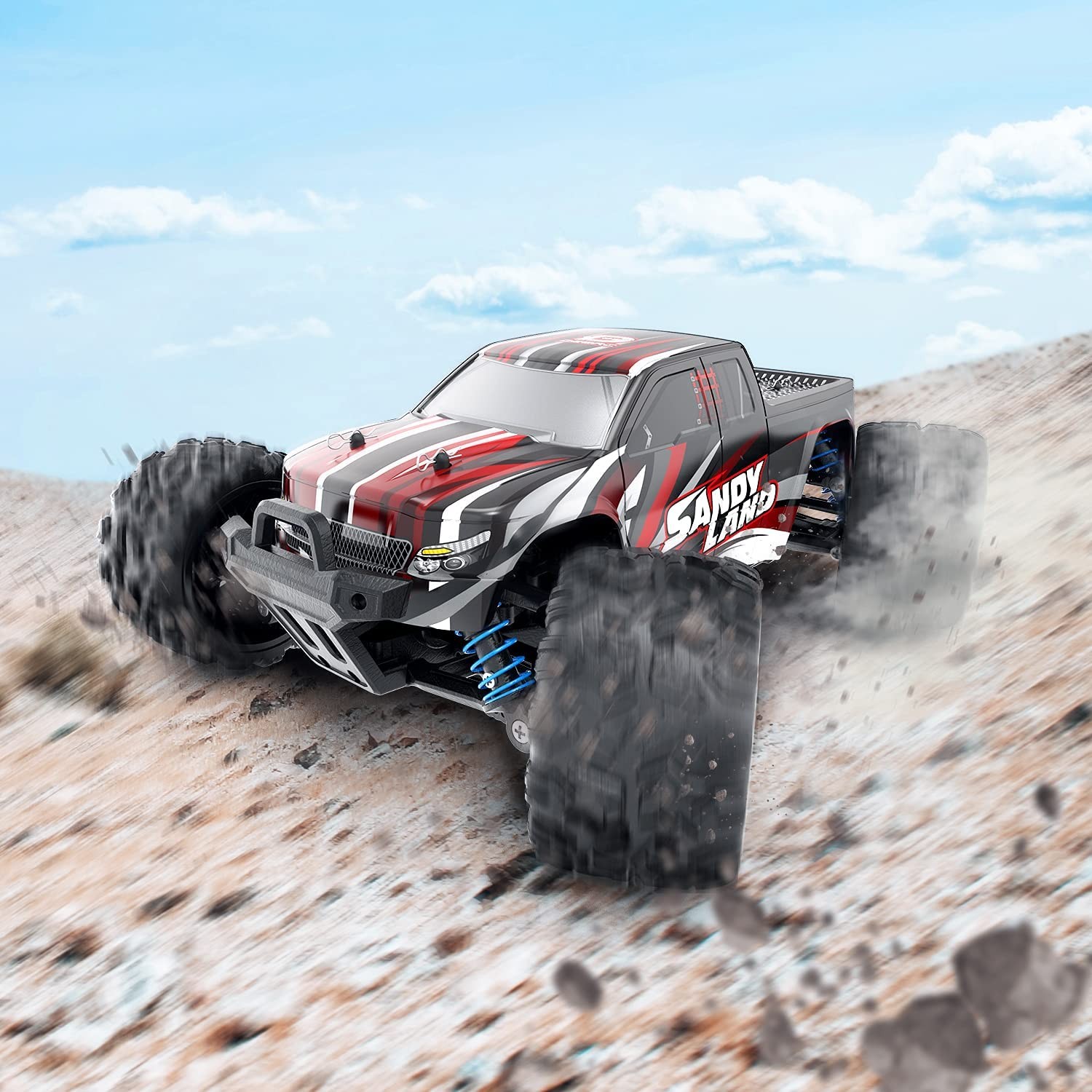 Two Batteries & PA Chassis: RC cars come with two 7.4V/850mAh batteries, you can enjoy the fun of driving for about 40+ mins a time (20+ mins for each battery). And the chassis is made of nylon which has many properties. It is the best choice for RC trucks enthusiast! (Please note that you may receive 2 types of packaging. 1. One battery is in the car and the other is in the packaging. 2. Two batteries are both in the packaging. Amazon will send them randomly, thanks for your patience and reading)