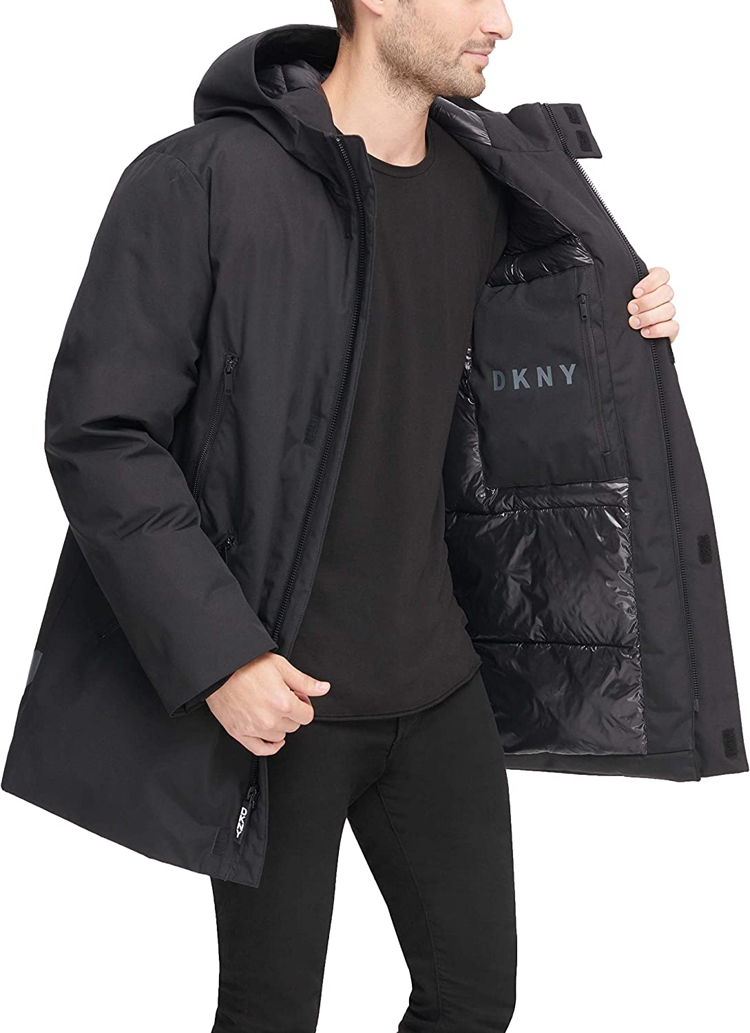 Two breast threaded pockets on the zipper, two lower threaded pockets on the zipper, and one inner lining pocket with screen print with dkny logo and zipper clasp.
