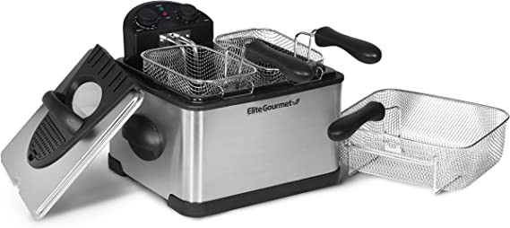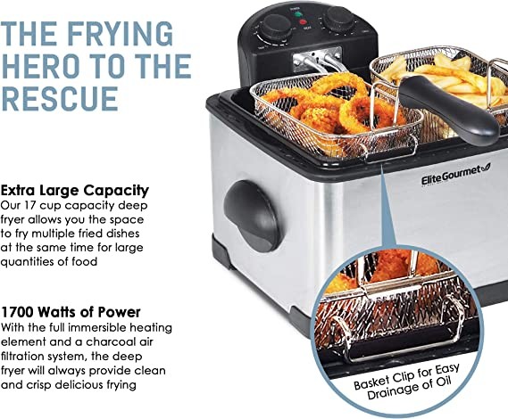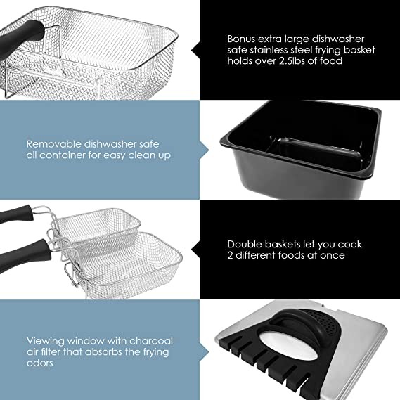 Includes 3 baskets: 1 x 4 qt. + 2 x 2 quarts. The frying basket can fry fish and chips at the same time. The 4.2L enamel tank is easily removed for easy cleaning.