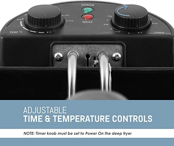 Immersion Heating Element: With power and ready lights, easily removable for hand washing. Temperature control knob up to 350°F and timing knob for ultimate control when frying.