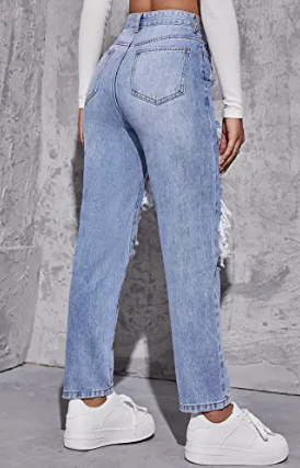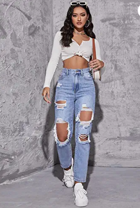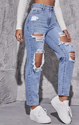 High waist, torn jeans, lightning on buttons in front, denim trousers with the effect of rubbing