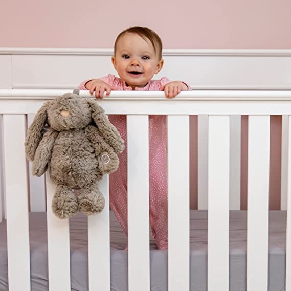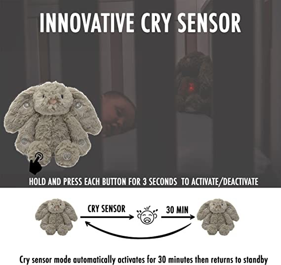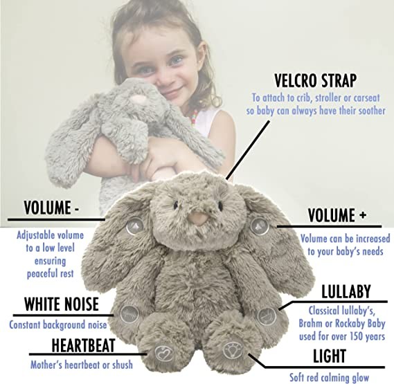 Fall asleep to soft music. This empty sleeping rabbit has 6 sleeping sounds that provide fine white noise, baby trembling, mother's heartbeat or classical hypnotic music, including Brahms or rock.