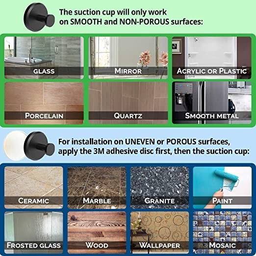 CAUTION ★ The suction cup only work on Glass, Mirrors, Porcelain tiles, Acrylic/Plastic shower inserts, Stainless steel, Quartz, Laminate, and other smooth and non-porous surfaces. --- First apply the INCLUDED adhesive discs to attach to uneven and porous surfaces