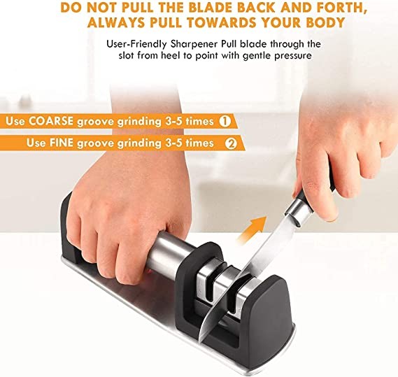 [2-Stage Sharpening System]: Coarse grooves are suitable for sharpening blunt knives, while fine grooves are for polishing and fine grinding. Easily give your dull knives a new start with the Level 2 Knife Sharpener.