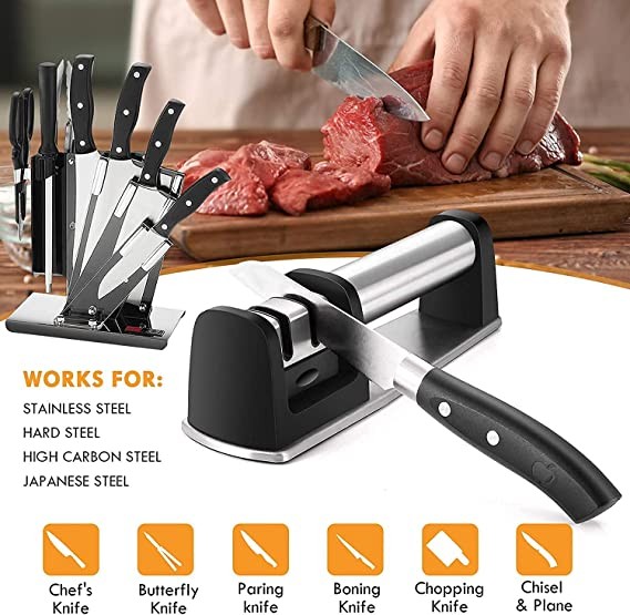 [Widely Applicable]: Our 2-stage sharpener is suitable for both straight edge blades and serrated edge blades, but not suitable for household scissors.