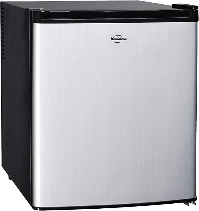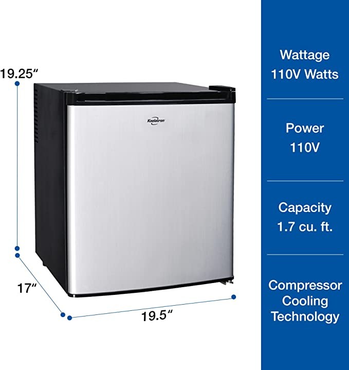 Perfect fit: The black and stainless steel surfaces of this portable compact refrigerator look sleek and modern, while the door storage compartment makes it easy to organize drinks and snacks