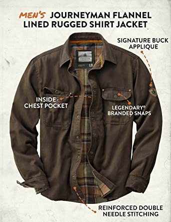 We added a flannel lining to our popular weathered cotton 'leather' shirt to build this one-of-a-kind shirt jac. The rugged cotton suede look comes with an unexpected softness. Features side hand warmer pockets, antique brass Legendary snaps, Signature Buck applique, and double needle stitching. Cotton/poly blend. Big & Tall sizes are designed for men over 6'2" and add 2" in body length and 1-1⁄2" in sleeve length.