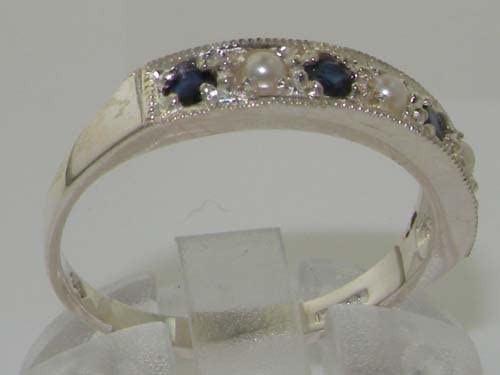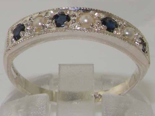 LetsBuyGold 18k White Gold Cultured Pearl and Sapphire Womens Band Ring - Sizes 4 to 12 Available