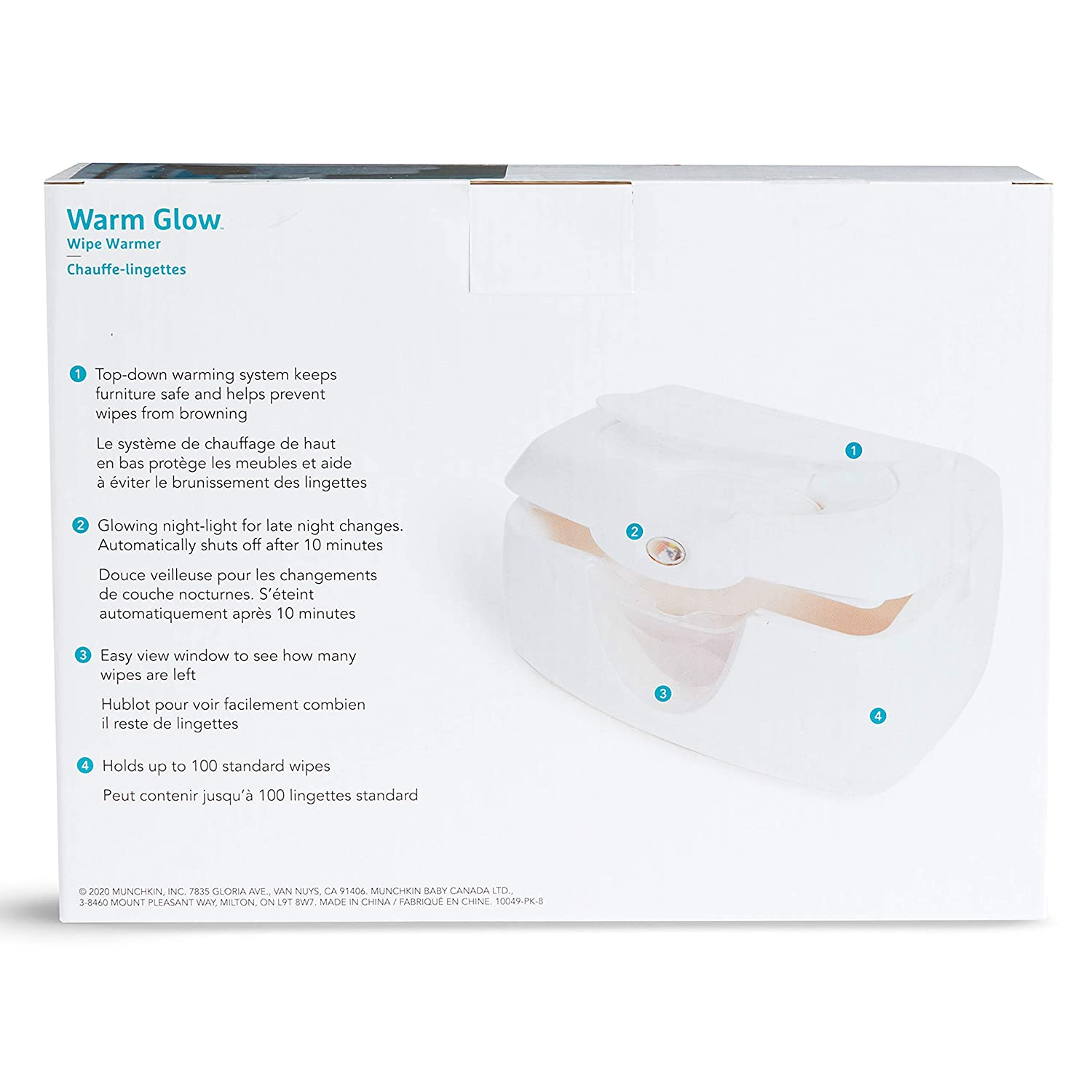 Clamshell top covers for easy wipes. The night light will automatically shut down in 10 minutes