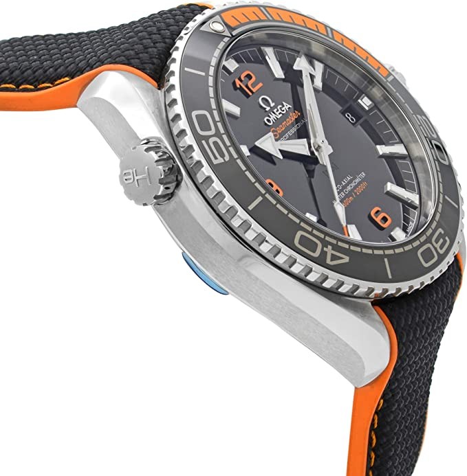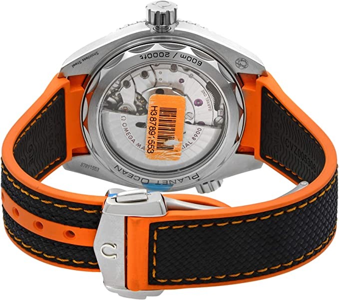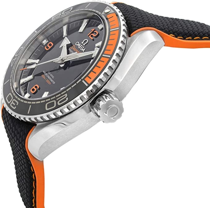 The black dial is enhanced by luminescent silver arrow-shaped hands. Silver stainless steel case, orange rubber and black nylon strap. Automatic movement. Water-resistant to 600 m / 2000 ft. Unidirectional rotation of the bezel. Scratch-resistant sapphire crystal. Transparent bottom cover. Deployment buckle. Screw-down crown. Case dimensions 43.5 mm x 16.04 mm. With 22 mm x length. Omega 215.32.44.21.01.001 Seamaster Planet Ocean Watch。