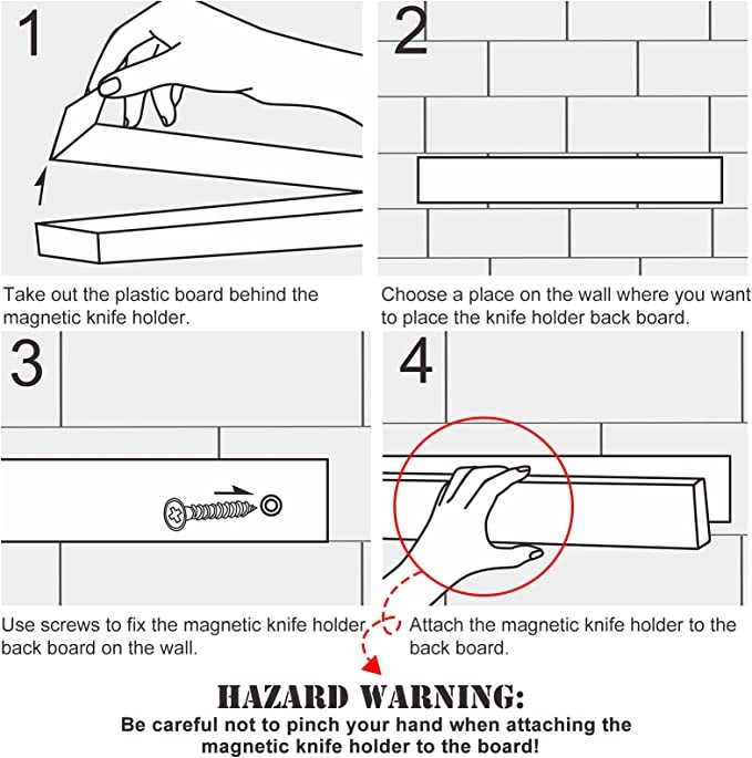 Easy to Install Knife Magnet- This magnetic knife strip comes with mounting hardware and easy to follow illustrated instructions( except for the double-sided tape in the manual) on the webpage so you can mount the magnetic knife strip and organize your kitchen right away! The back board is covered with protective film to protect the magnetic knife holder from being scratched during transport, you can tear off it when installing the knife magnetic strip.
