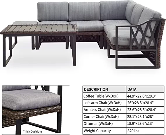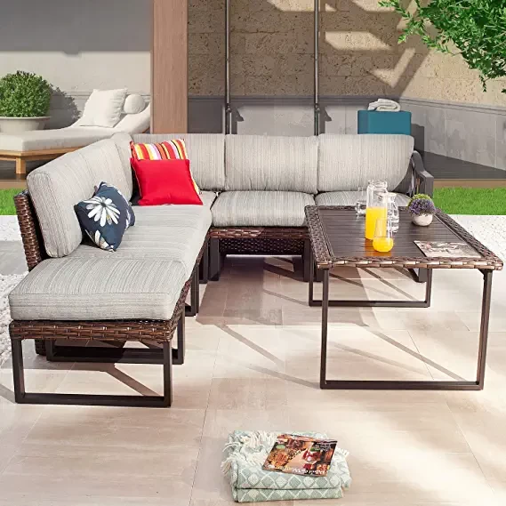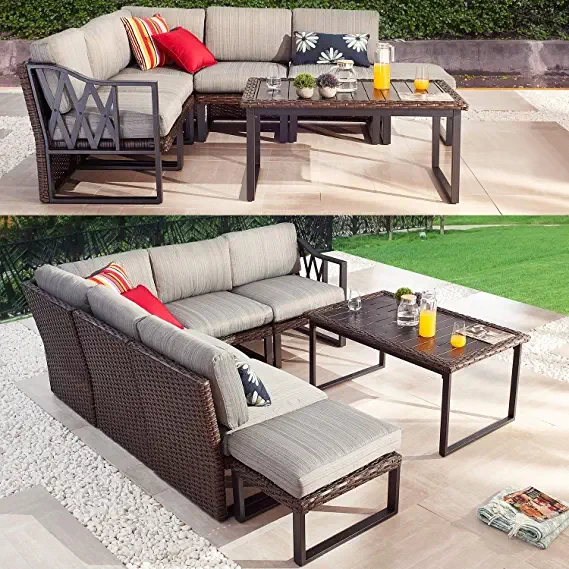 Capacity: this patio interview set can comfortably accommodate 6 people. Flexible modular seats allow you to move the seats onto the patio to fit your outer living area. The patio conversation set consists of 7 items: 1 left chair, 1 corner chair, 3 armless chairs, 1 Ottoman and coffee table 1. With these items for conversation in the courtyard you can turn them into at least 4 different ways (sofa, l-shaped sofa, double chair or sectional)