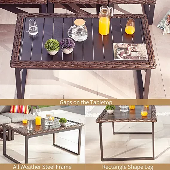 Rectangular coffee table: the slit on the top allows rain to fall through the slit on rainy days, without accumulating water on the top, easily washes. The weight of 30 pounds will keep him in place in any weather. The construction of rectangular legs is easy to locate. The table is 44.9 inches wide and can be comfortably located with a drink.