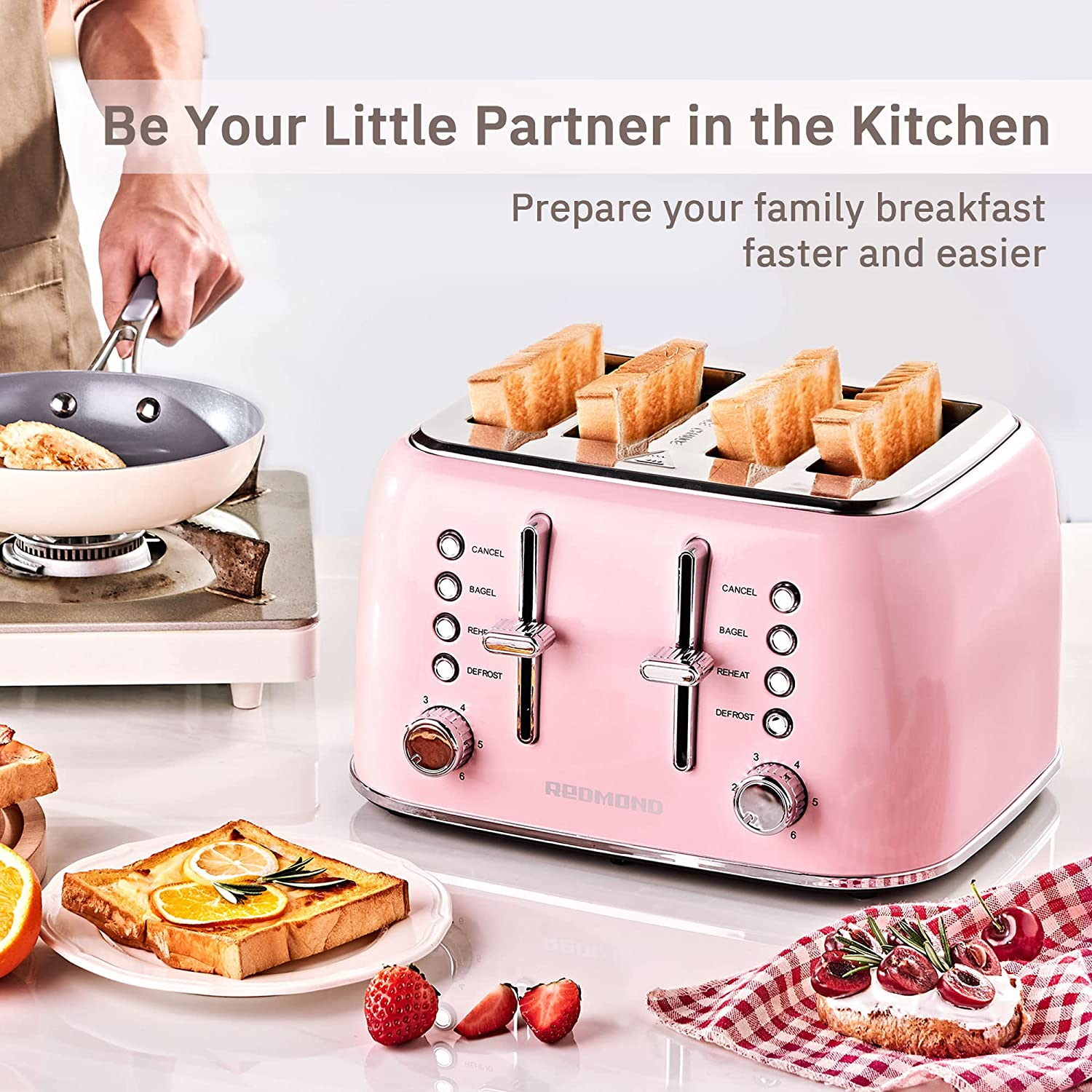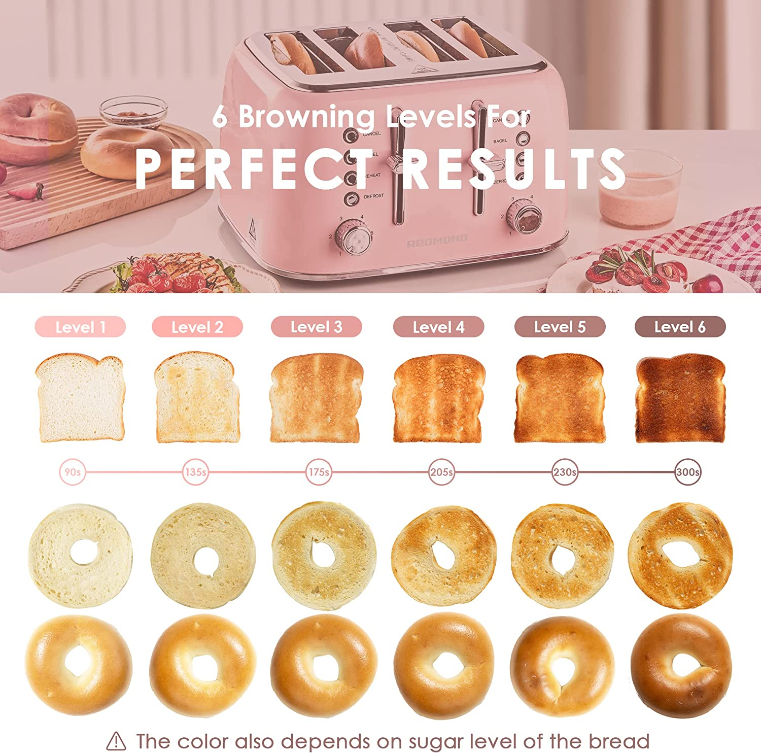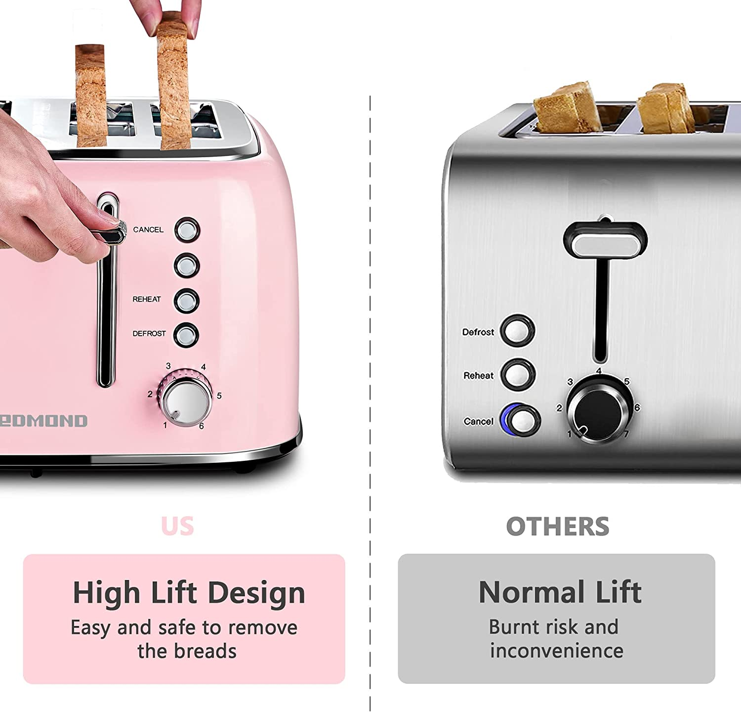 1.5 "super wide slot (~ 3.8 cm); With holes of 5.5 holes (~ 14.0 cm) x 1.5 holes (~ 3.8 cm) Redmond retro toaster with 4 slices easily handles bagels, English cupcakes and much more. Thicker or smaller products such as pumpkins. Cakes and Texas toast. The stainless steel structure avoids rust, all stains are easily removed. Food friendly materials that do not contain bisphenol a can provide better safety for family members during a delicious breakfast.
