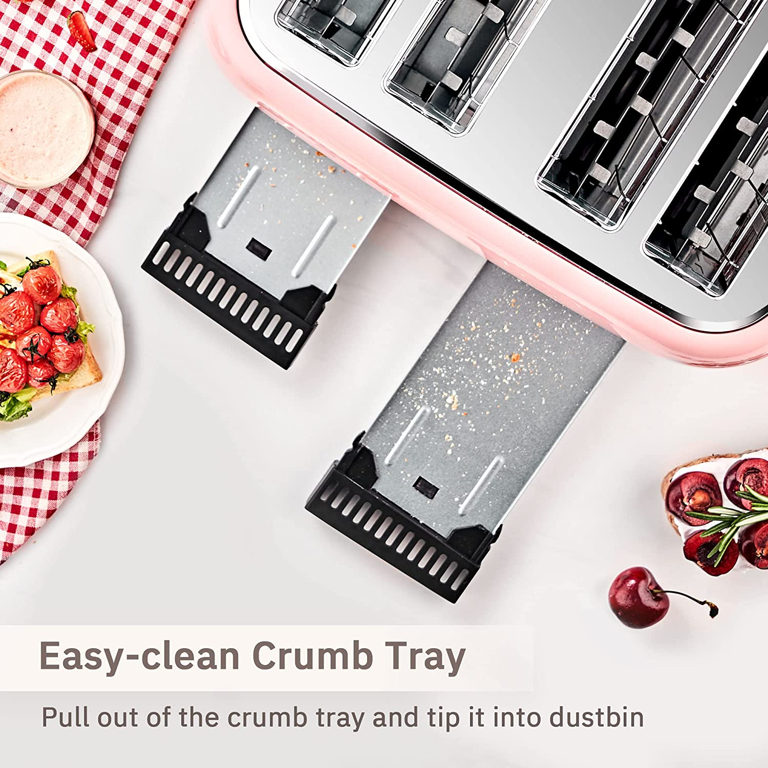 Beautifully decorated; This retro toaster on 4 slices is perfect for your kitchen and creates the perfect atmosphere for valentine's day. Stainless steel finish combined with high quality paint will give color to any corner of your home. The raised structure provides additional protection to avoid the risk of burns when removing bread. Pull the removable tray down to drop the crumbs after roasting, very easy to clean. Attention - all toasters of this model are supplied in the same package, but the color inside the product depends on your choice