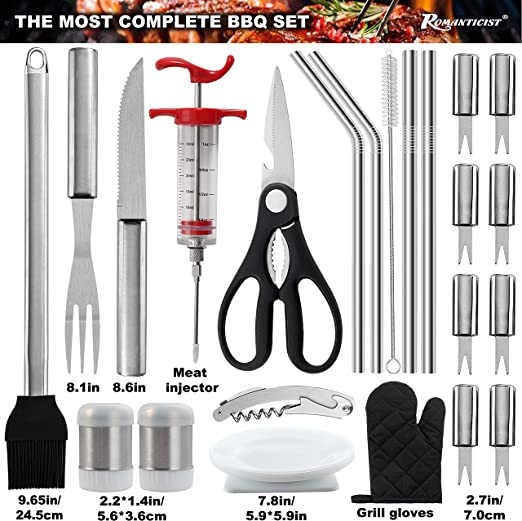 【QUALITY GRILLING ACCESSORIES】Each Essential of the grilling tool kit is made from high quality stainless steel, which is glossy, rust-resistant and heavy duty. No need to worry about sudden bending or melting in the process of grilling and all BBQ accessories can retain luster, durability and flexibility over years of use.