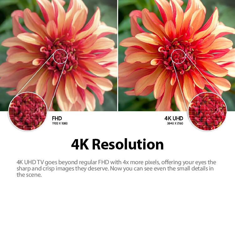 - 4K UHD TV goes beyond regular FHD with 4x more pixels, offering your eyes the sharp and crisp images they deserve. Now you can see even the small details in the scene.