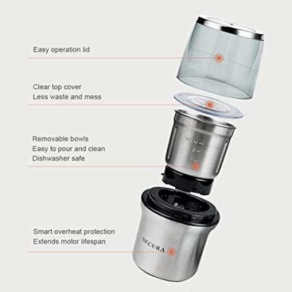 Secura coffee grinder has built-in smart overheat protection to prolong motor life