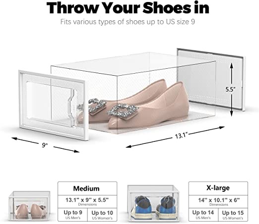 Throw Your Shoes In: Each box measures 13.1"L x 9"W x 5.5"H (approximately 33.1cmL x 22.9cmW x 14.9cmH), suitable for all types of shoes, all are welcome to buy these shoe boxes .
