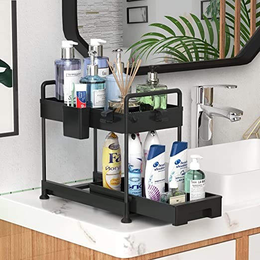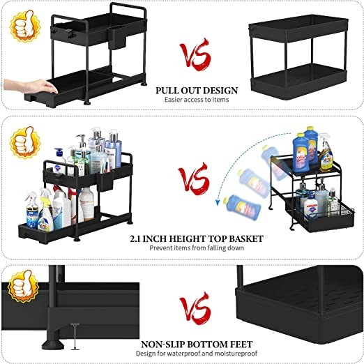 【Slide Out Drawer】The bottom slide out drawer of the under sink organizer makes it easier to access items and place them in limited spaces. 2-tier design, make full use of vertical space.
