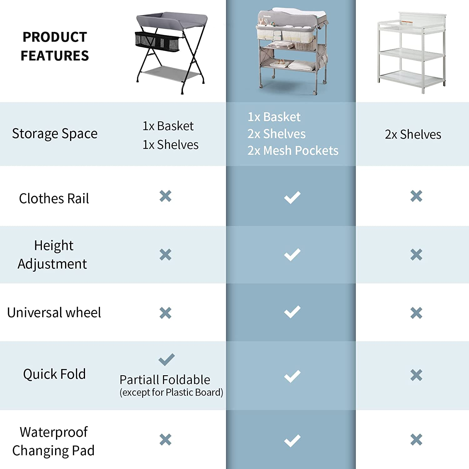 Easy to clean waterproof pad - The top of the changing table is made of high quality waterproof special material. You don't have to worry about cleaning, as smooth surfaces are easy to clean with a damp cloth. You don't need to spend extra money on waterproof changing pad liners.