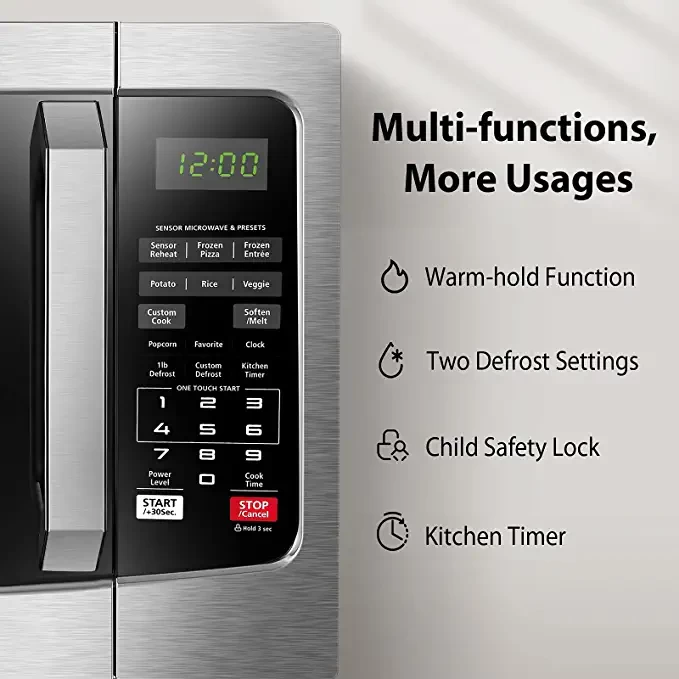 Popcorn button in one touch and heat maintenance function with eco-mode, mute/mute option and child protection