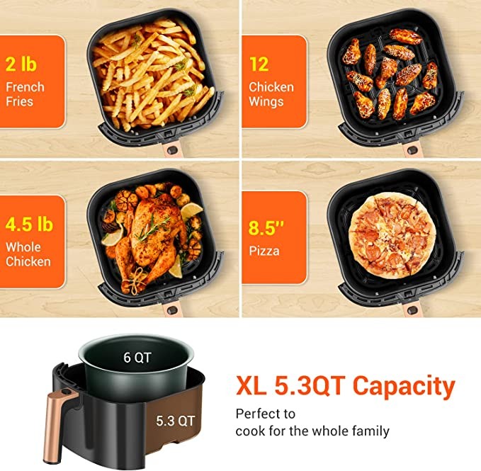 ?? ?.??? ???????? & ????-???????? ??????: Feed up to 5 people or fit a whole roast chicken, 5.3QT large square basket is an ideal choice for family and fits perfectly on any kitchen countertop. An ergonomic touchscreen control panel displays a full view of your cooking progress, increasing visibility and ease of use without bending over.