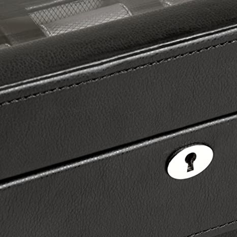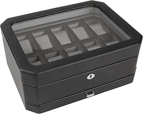 Mid-Century Inspired Watch Box - 10 Watch Storage, 8 Ring Rolls & 17 Cufflinks & Jewelry, Chrome Hardware, Locking Glass Lid