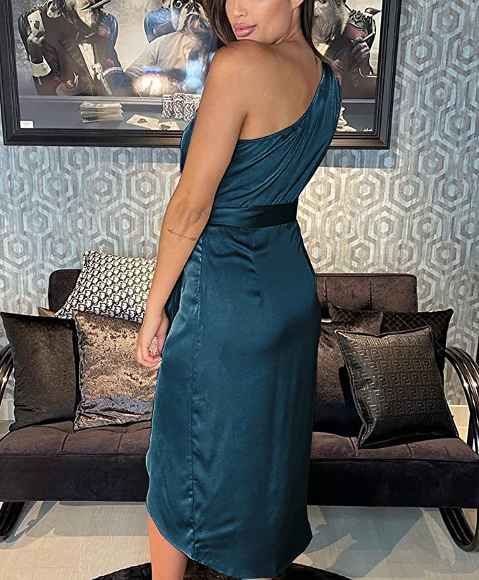 STYLISH DESIGN: One Shoulder Midi Dress /Sleeveless Bodycon Dress For Women/Asymmetrical Hem Ruched Dress/High Waist Pencil Dresses/Fitted Dress With Belt/Solid Color Wrap Dresses/Midi Length Split Dress/Satin Dress For Women/Club Party Dress For Women/Slim Fit Cocktail Dress/Evening Dress For Women/Elegant Wedding Guest Dress