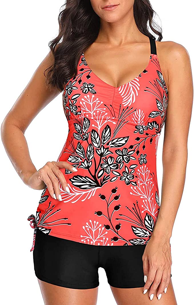 2 Piece Tankini: The red floral printed two piece tankini swimsuit comes with shorts, removable padded bras, adjustable wide shoulder straps, and an athletic style.