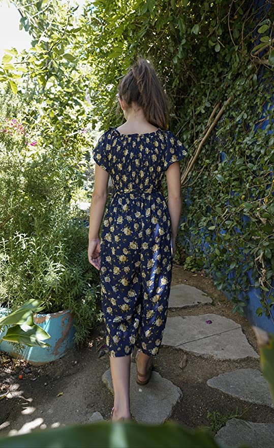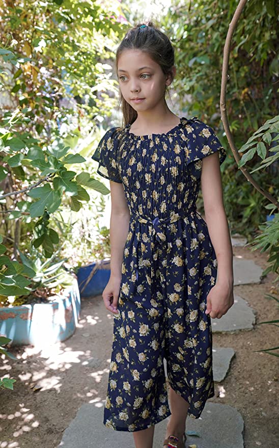 Beautiful and charming chiffon jumpsuit with trendy smocking details, or cascading ruffles on upper body and wide leg mid-calf length bottom.