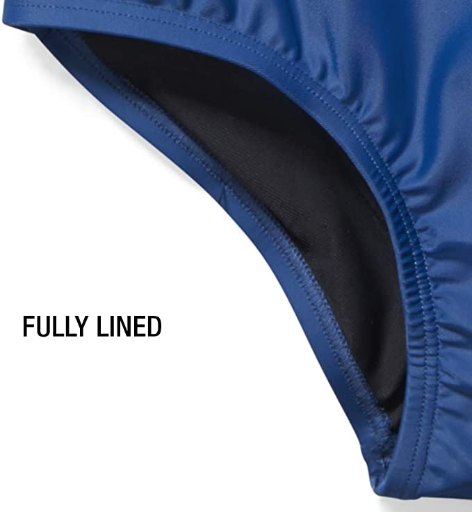Racerback one-piece swimsuit featuring scoop neckline, back cutout, and shelf-bra construction