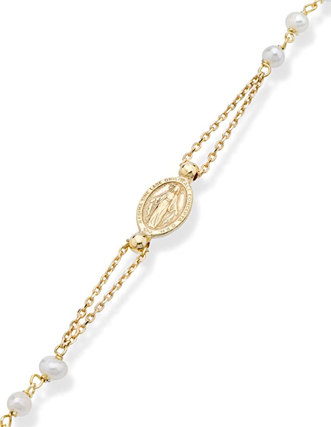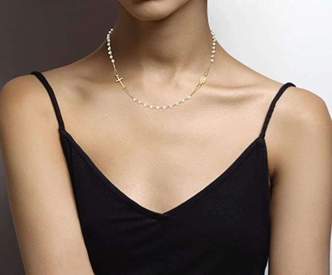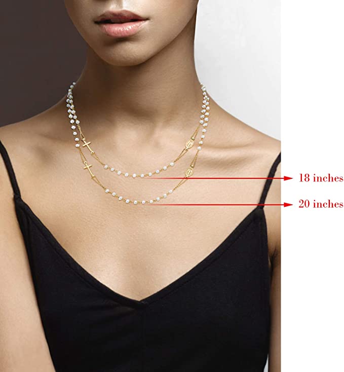 STYLISH AND INSPIRATIONAL - Show your spiritual side with this 18K gold plated sterling silver rosary necklace featuring genuine cultured pearl station beads, a Miraculous Medal of the Virgin Mary and a polished cross. A modern twist on the classic rosary, this minimalist chain can be worn as a symbol of one’s faith or as cool fashion statement. This dainty, everyday glam chain is beautiful with both casual and dressy outfits. Wear layered with other chains for a hip and trendy look.