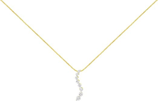 Eight stunning prong set round cut diamonds create a soft wave in this 14k yellow gold journey pendant. Baguette cut diamonds are set into the sides of the pendant giving it an unexpected design element that adds shimmer and elegance to this piece. The 3 carat TDW diamond pendant dangles from a box chain that secures with a spring ring clasp.