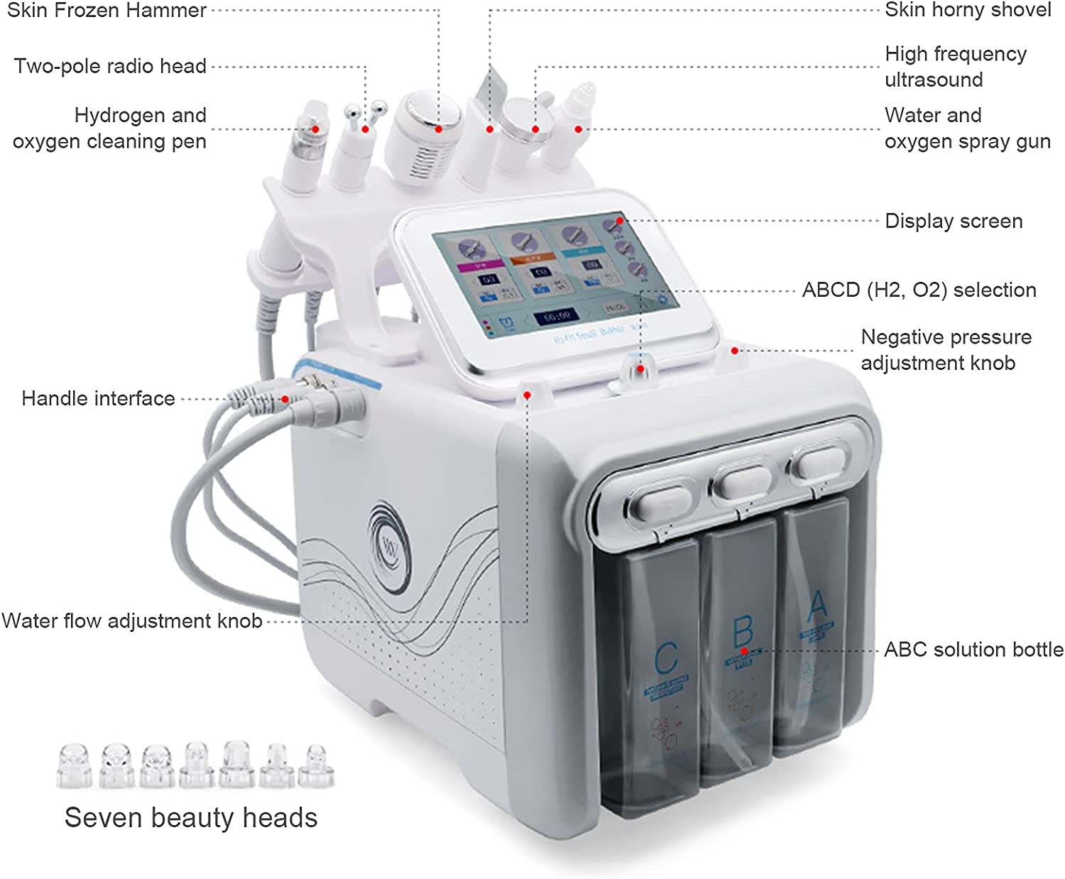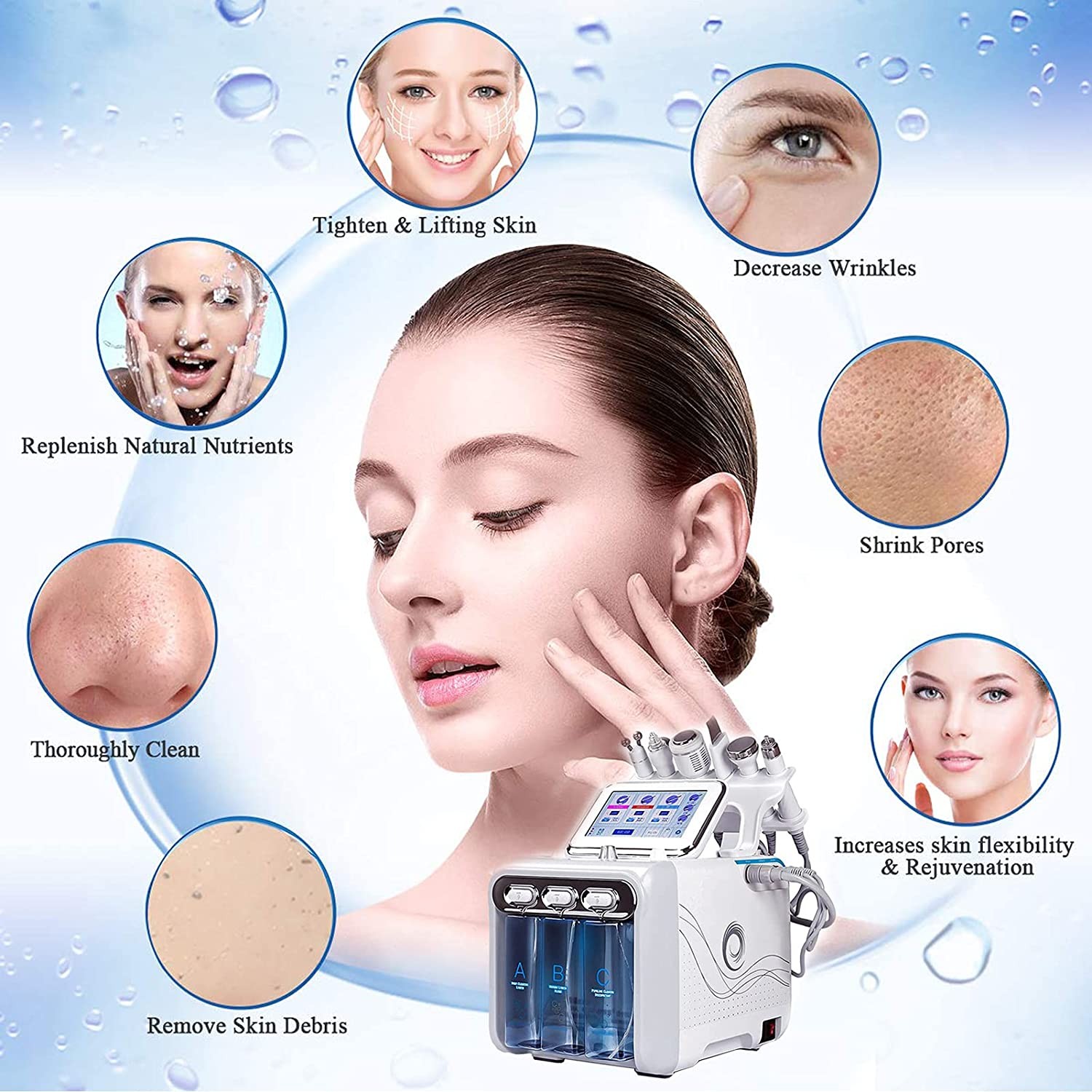 Multieffect effectiveness: 6 in 1 hydrogen and oxygen cosmetic apparatus have a multifaceted effect on facial skin care, remove skin contamination; Narrow down the pores; Tighten the skin and reduce wrinkles; Improves skin elasticity; Help rejuvenate the skin.