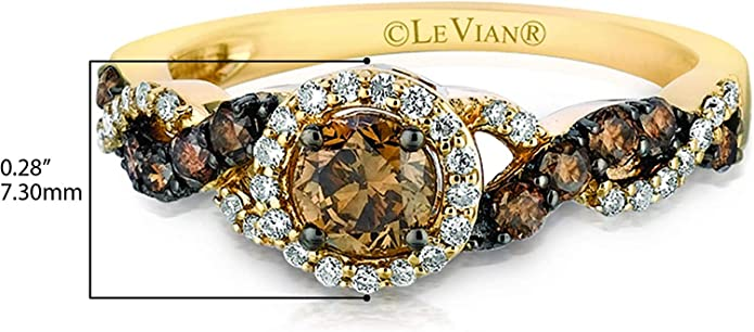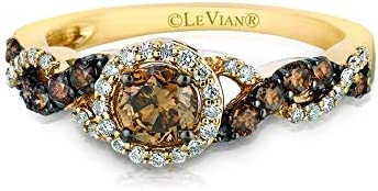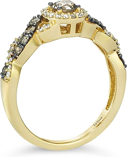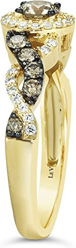 Impeccable Elegance - This stunning handcrafted 14k yellow gold ring by Le Vian features a large round fancy brown diamond surrounded by brilliant white diamonds. This ring features a crossed setting with white and brown diamonds set with black rhodium-plated inlays that are intertwined three times to bring out their color. This gorgeous ring is the tall statement you've been looking for. It's sure to attract compliments at your next party or special occasion