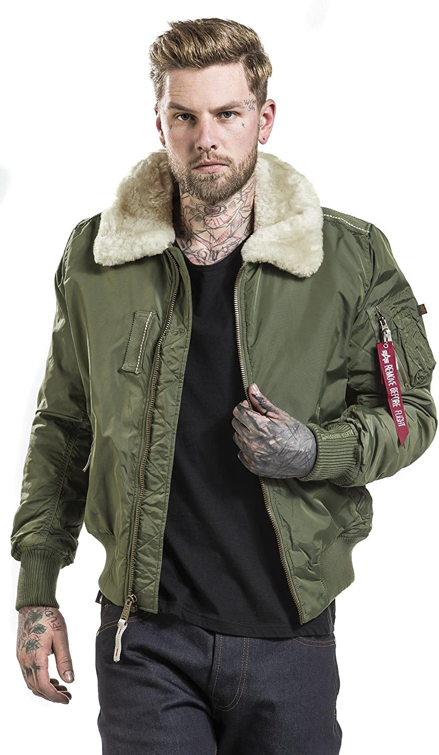 Alpha industries injector iii rep jacket is blue with Sherpa collar, two front side pockets on lightning, one pocket with logo. The men's jacket also has alpha industries glued to the left sleeve, zipper in the front, base on buttons, hood on the shoelace. The jacket also has elastic rib cuffs and NCDS.