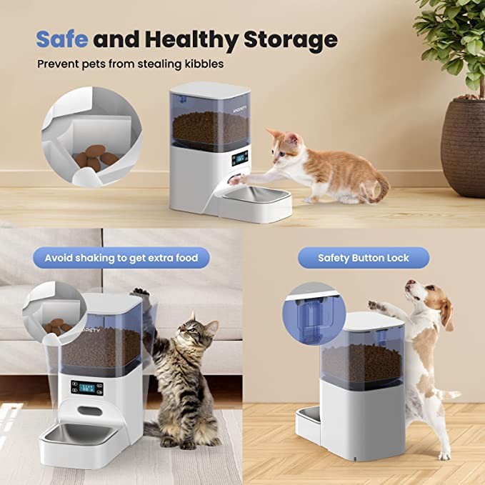 ?【Enjoy Every Bite of Dry Food】Automatic cat feeders adopt triple seal technology to lock in freshness, with built-in odorless dehumidification bag of high moisture absorption( replaceable), to keep food fresh and crispy. The 4L food tank can meet the needs of most cats and small/medium-sized dogs. A safety button lock on the top lid also prevents pets from getting food.
